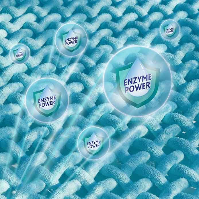 Zawarte w niej naturalne enzymy rozkładają resztki tłuszczu i brudu, dzięki czemu ściereczka pozostaje czysta i higieniczna nawet dwukrotnie dłużej. Innowacyjne działanie enzymów utrzymuje się przez co najmniej 10 prań, zapewniając długotrwały efekt czystości i świeżości.